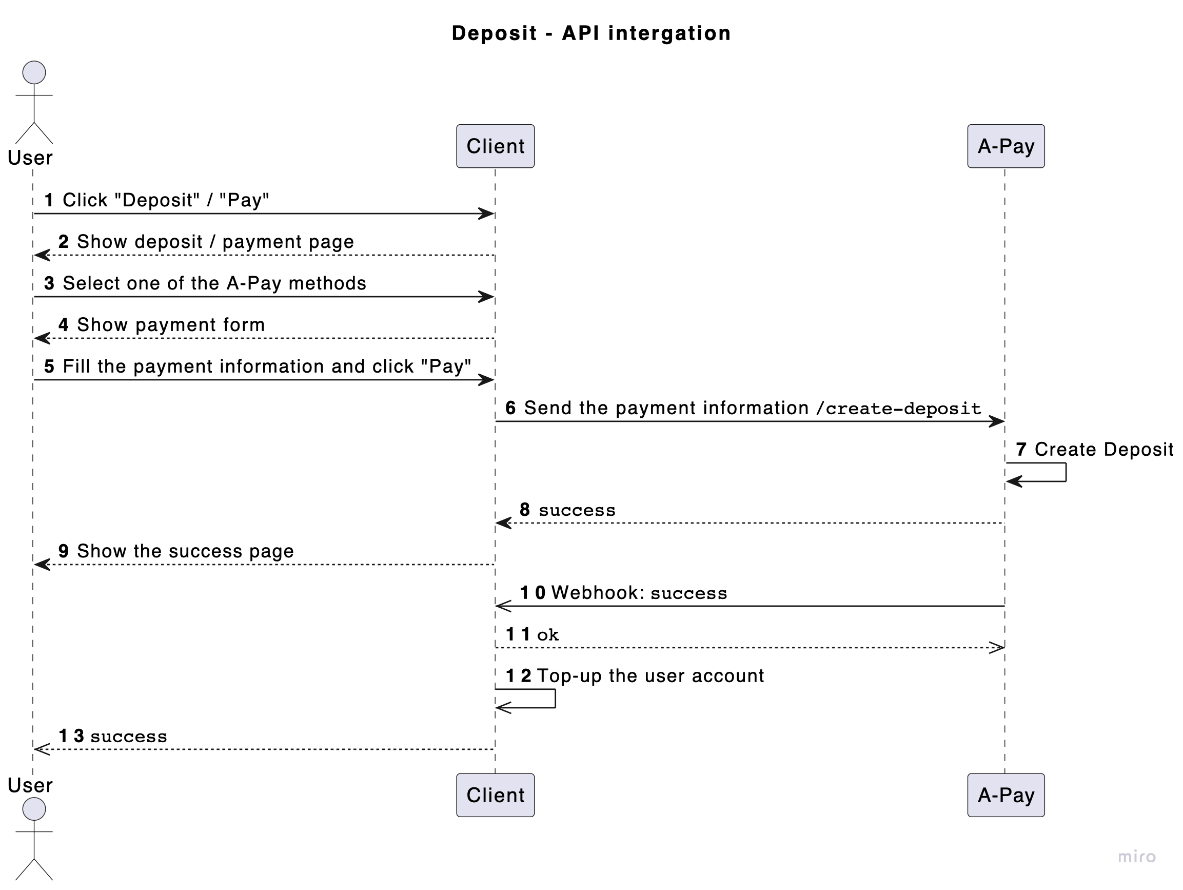 <figure><img src="https://581082779-files.gitbook.io/~/files/v0/b/gitbook-x-prod.appspot.com/o/spaces%2FdRt6CV4HPvnslXUaqL9U%2Fuploads%2FR7ttjw2VblQxeu5g29EW%2Fimage.png?alt=media&#x26;token=d638455b-d8b6-4599-bd48-d7a5e457a228" alt=""><figcaption><p>Sequence diagram of the Deposit via API integration</p></figcaption></figure>